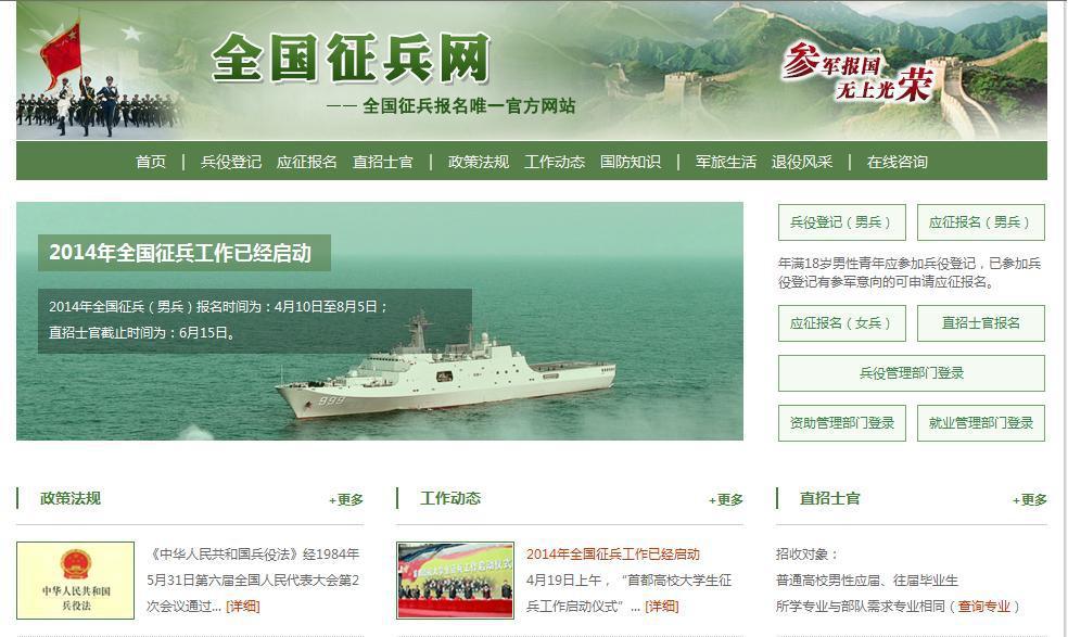 2、登录“全国征兵网”(网址:http://www.gfbzb.gov.cn)填写兵役登记和应征报名信息(包括个人姓名、公民身份证号码、家庭住址、参军意向等基本信息),根据网上提示打印《男性公民兵役登记/应征报名表》;符合参军基本条件的全日制普通高校学生,还须打印《大学生预征对象登记表》、《应征入伍高校学生补偿学费代偿国家助学贷款申请表》。