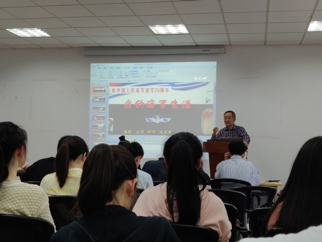 讲座伊始,马国祥老师首先对庄民生教授进行了简单的介绍,希望全体学院用心听、用心记,并对学员提出了要求,要求学员在学习后进行分组讨论,增强学习效果。庄民生教授在讲座过程中,首先通过PPT放映的形式,展示了海军的发展历程和自身多年的海军从军经历,从庄教授的PPT放映中,学员们了解了伟大的人民海军从无到有、从弱到强的发展历程,也看到了庄教授为国献身国防的精神品质。在讲座过程中,庄教授结合人民海军建军70周年,结合新中国成立70周年发生的翻天覆地的变化,结合自身从戎经历,从一个个真是的故事切入,吸引学员们积极关注、积极学习。学员们从我军小艇与国民党大舰的殊死战斗中,我人民海军“一不怕苦、二不怕死”,最终在敌强我弱的情况下,最终赢得胜利的鲜活案例中,深受教育和启发。学员们纷纷表示,新时代的大学生一定要继承革命先烈的拼搏精神、奋斗精神和牺牲精神,一定要发奋图强、一定要砥砺前行、一定要牢记使命,为实现中华民族的伟大复兴而努力奋斗!