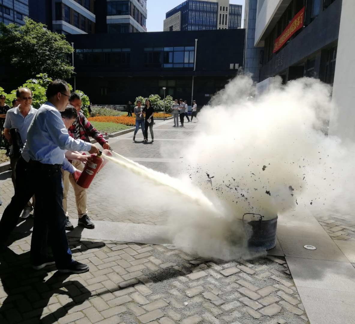 下午14:00演习正式开始。首先模拟杨浦校区长阳路致远楼二楼突发火灾险情,有浓烟冒出。发现险情的老师立即报告学院并报校保卫处,学院迅速启动应急预案,警报声立即响起。在安保人员的指挥下,各楼层学生用湿毛巾捂住口鼻,迅速沿安全通道逃生至楼下开阔区域。与此同时,办公室主任组织相关教师和学生快速清点人数,并向总指挥报告人员疏散情况。随后,校保安队负责人带领师生开展了灭火演习,演示灭火器使用方法,随后大家轮流进行了灭火器的使用练习,演习全程井然有序,达到了预期目标。